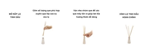 - Bước 3: Cắm que toả hương xuyên qua nắp cao su. Tinh dầu sẽ được que mây hút lên. Cắm càng nhiều thì càng thơm và tinh dầu hết càng nhanh.